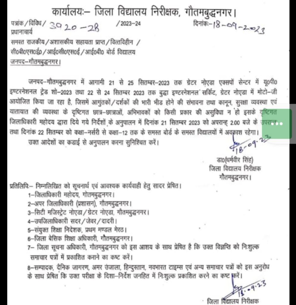 ग्रेटर नोएडाl उत्तर प्रदेश के महत्वपूर्ण जनपद गौतम बुद्ध नगर में 21 सितंबर के 2:00 बजे से लेकर 22 सितंबर तक इंटर तक के स्कूल बंद रहेंगे l इस आशय के आदेश गौतम बुद्ध नगर के जिला विद्यालय निरीक्षक डॉक्टर धर्मवीर सिंह ने दिए हैं l