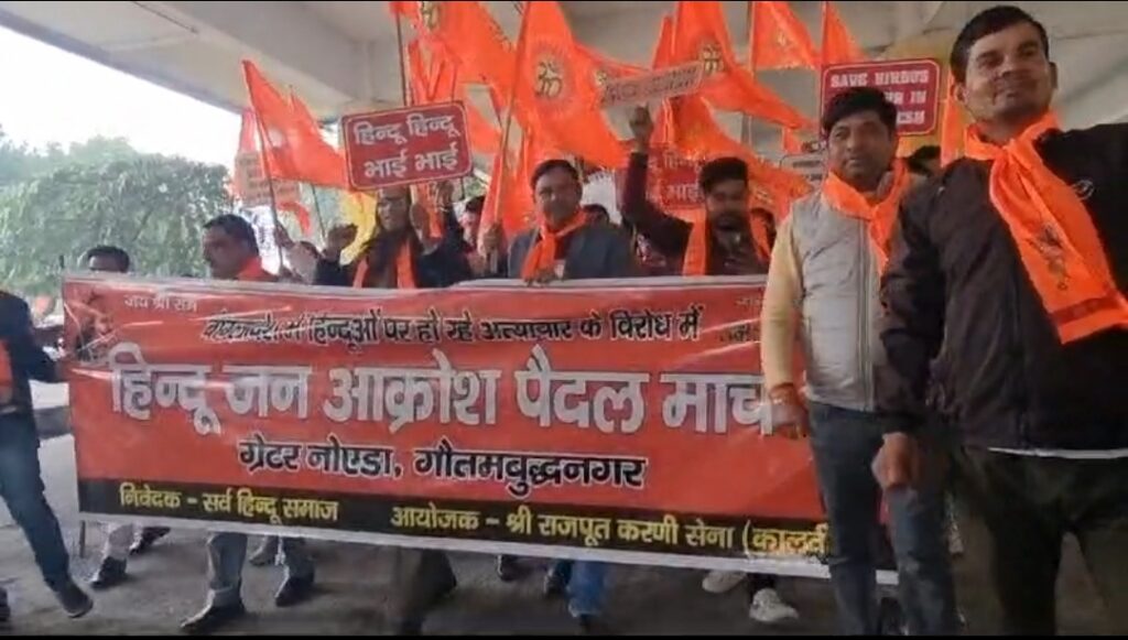 ग्रेटर नोएडा में सर्व हिंदू समाज और तमाम हिंदू संगठनों ने बांग्लादेश में हिंदुओं पर हो रहे अत्याचारों के खिलाफ जोरदार विरोध प्रदर्शन किया। अल्फा वन सेक्टर से डीएम ऑफिस तक जन आक्रोश पैदल यात्रा निकाली गई, जिसमें सैकड़ों लोग शामिल हुए।