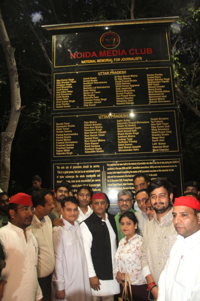 नोएडा मीडिया क्लब द्वारा सेक्टर 72 के स्मृति वन में बनाए जा रहे शहीद पत्रकारों के स्तंभ पर पहुंचकर अखिलेश यादव ने अपनी श्रद्धांजलि दी l उन्होंने कहा कि नोएडा मीडिया हब है और देश के लोकतंत्र की व्याख्या में मीडिया को इग्नोर नहीं किया जा सकता l उन्होंने नोएडा मीडिया क्लब के इस प्रयास की सराहना कीl उन्होंने कहा कि कोरोना काल के दौरान जो पत्रकार शहीद हुए हैं उनकी स्मृति में बनाया गया ये स्तंभ मील का पत्थर स्थापित होगा l यह जब तक धरा रहेगी तब तक स्थापित रहेगाl इस अवसर पर नोएडा मीडिया क्लब के अध्यक्ष पंकज पाराशर महासचिव विनोद राजपूत वरिष्ठ संतोष सिंह पत्रकार मोहम्मद आजाद रिंकू यादव ईश्वर सौरभ राय सुनैना सिंह इकबाल चौधरी सहित कई पत्रकार और समाजवादी पार्टी के नेता मौजूद थे l