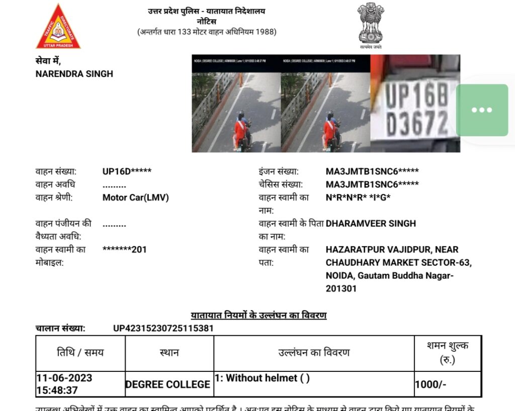 मामला कुछ यूं है कि नरेंद्र कुमार सेक्टर 63 स्थित हजरतपुर वाजिदपुर के निवासी हैं l उन्होंने एक वेगनार कार कुछ वर्ष पहले खरीदीl इसका नंबर उन्हें UP 16 DD 3672 मिलाl इन दिनों ऑनलाइन चालान का नियम नोएडा में लागू हैl जानकारी के मुताबिक एक बाइक पर सवार व्यक्ति महिला के साथ नोएडा के सेक्टर 39 स्थित डिग्री कॉलेज के सामने से गुजराl जिस समय ये दोनों बाइक पर सवार थे उस वक्त बाइक सवार महिला ने हेलमेट नहीं पहना हुआ था l