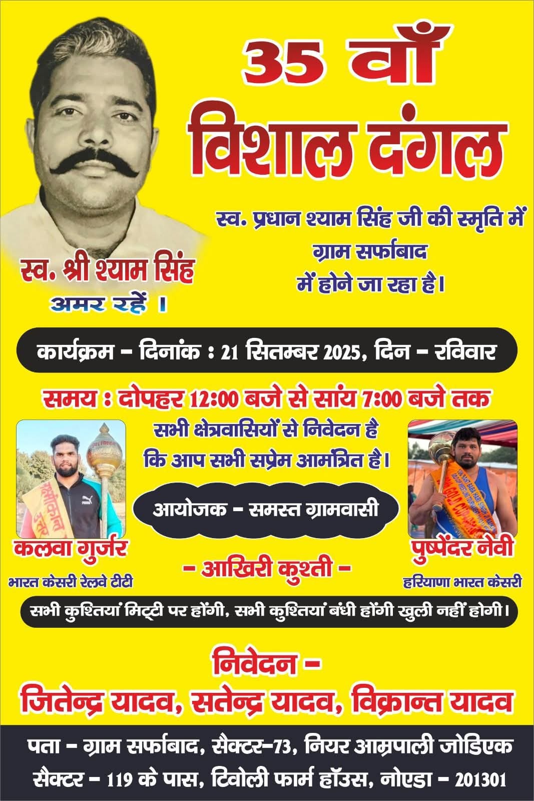 स्वर्गीय प्रधान श्याम सिंह की याद में 35वां विशाल दंगल 21 सितंबर को September 19, 2025 No Comments Read More »